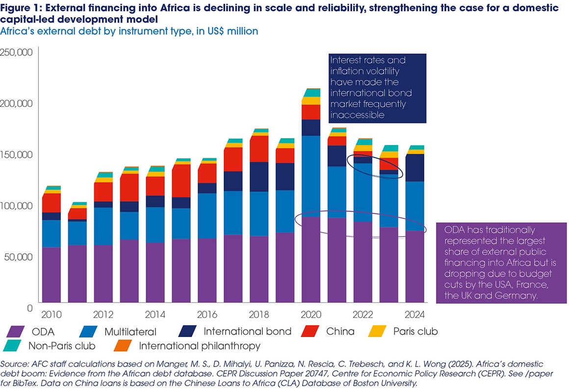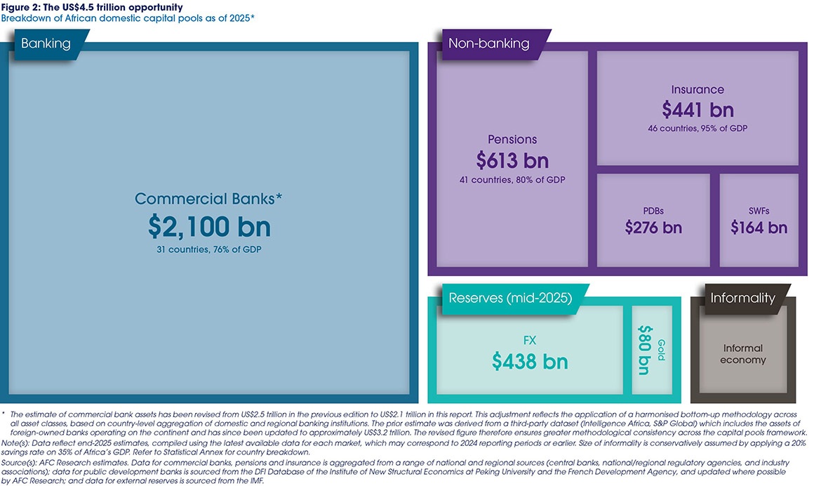 - External financing is retreating and domestic capital must step up. ODA fell by 23.1% in 2025, the largest contraction on record, while Africa’s capital pools now exceed US$4 trillion, including over US$1 trillion in pension and life assets, highlighting the growing potential of non-bank institutional capital.