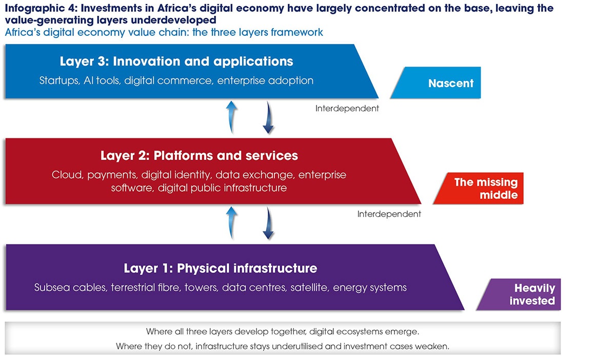 Digital transformation depends on the full stack – international gateways, national backbones, metro networks, data infrastructure, and enterprise platforms functioning together as an integrated system. While Africa has largely solved for international connectivity, the opportunity now lies in building the missing middle to move from infrastructure to economic systems.